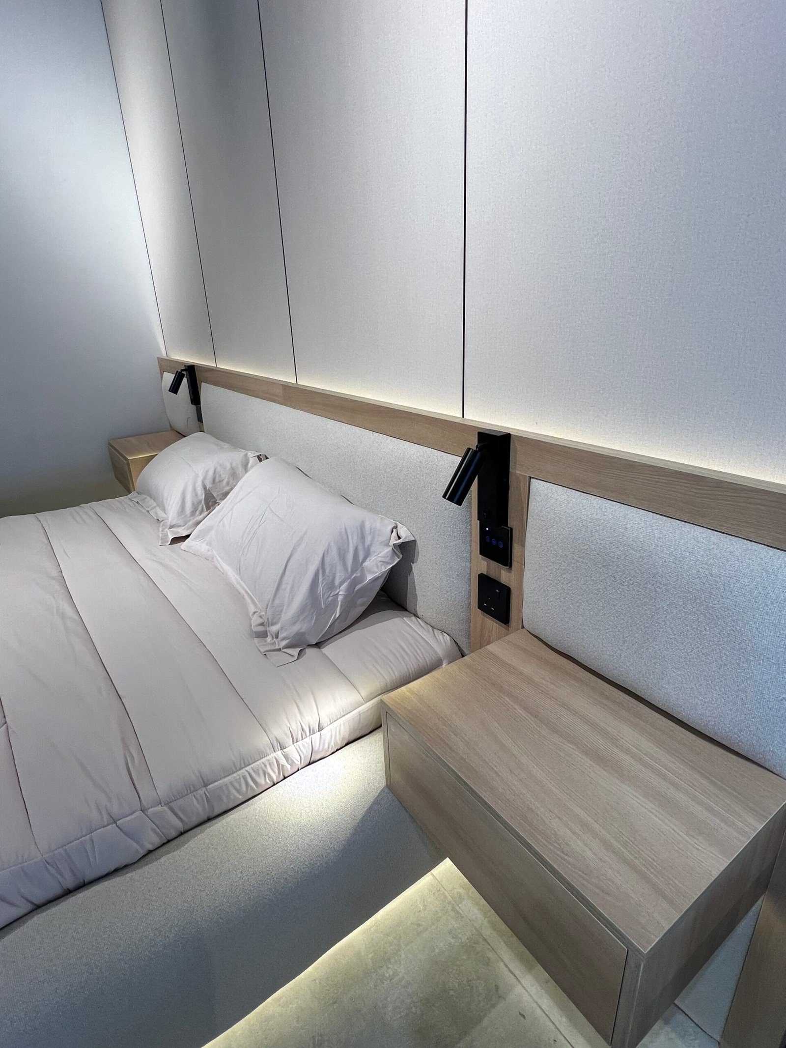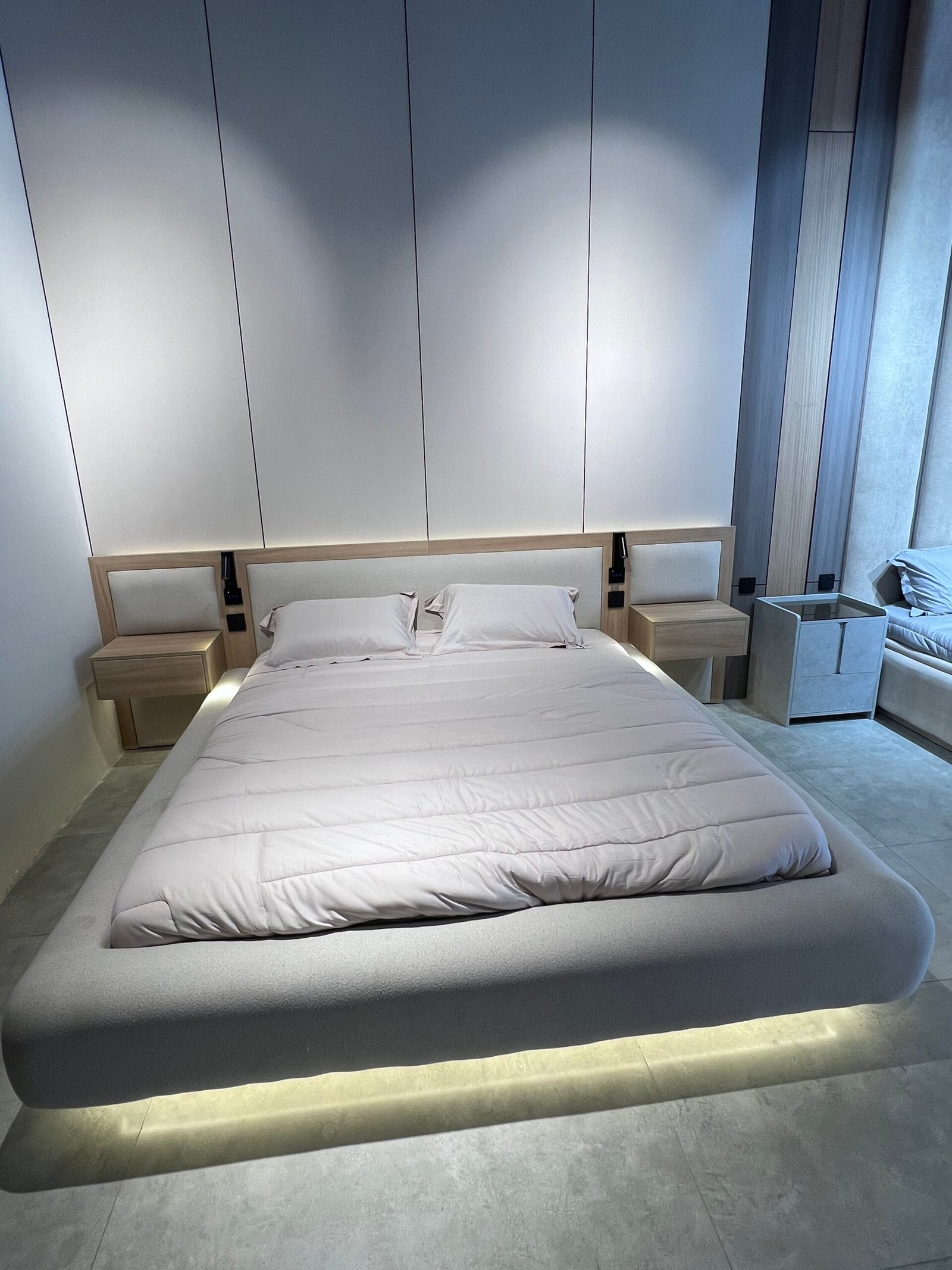 سرير الحجم: 2.10 متر × 2.10 متر + لوح رأسي ذو وجهين مع طاولتين جانبيتين معلقتين